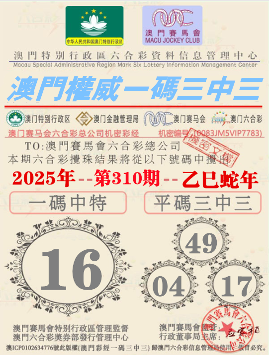 310期:【澳门权威资料】√一码三中三√ 澳门权威精准资料